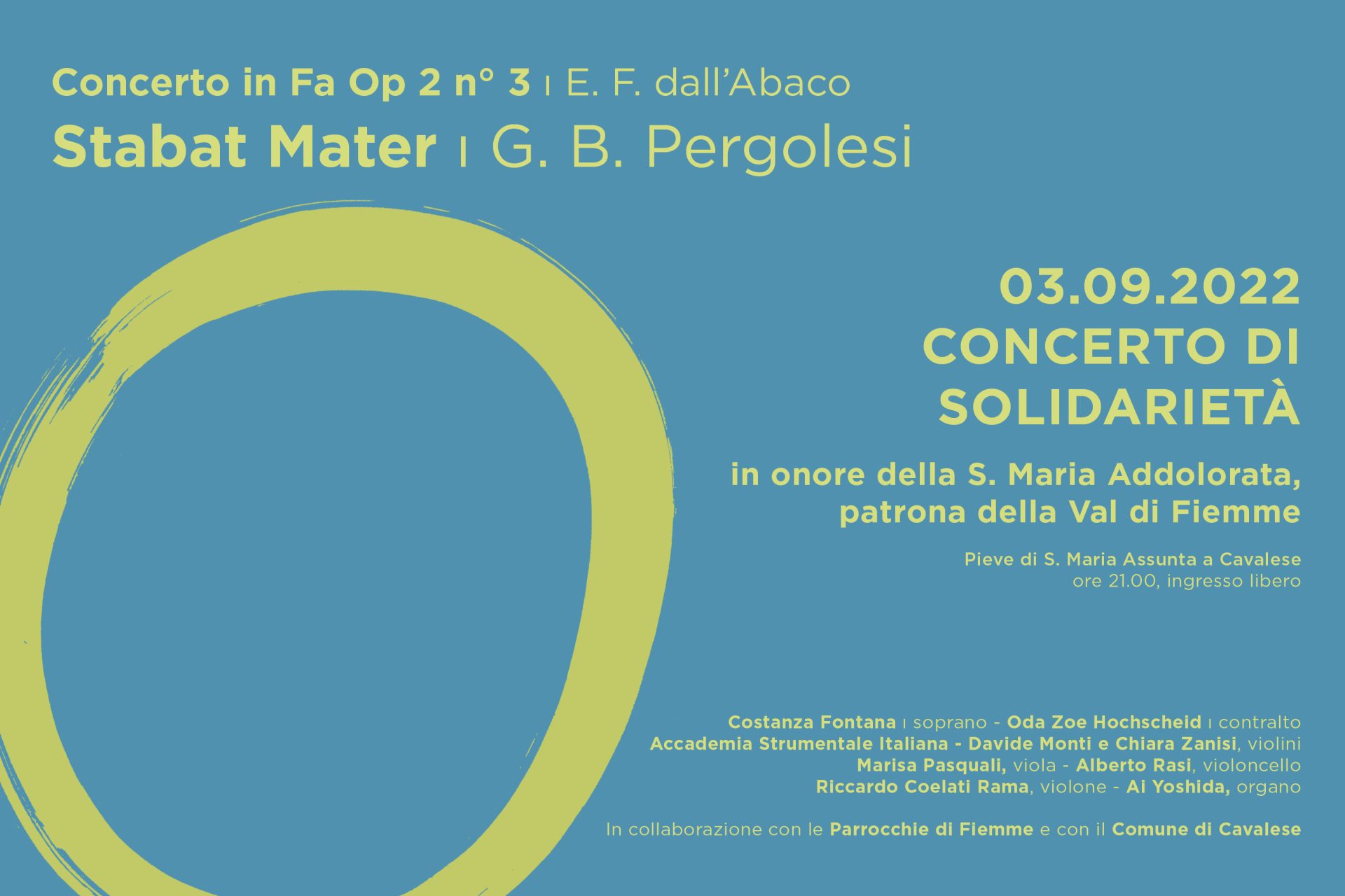 Sabato 3 Settembre 2022, ore 21 | Pieve di S. Maria Assunta a Cavalese |  INGRESSO LIBERO E. F. Dall'Abaco, Concerto in Fa Op 2 no. 3 G. B. Pergolesi, STABAT MATER CONCERTO DI SOLIDARIETÀ in onore della "Santa Maria Addolorata di Fiemme" per condividere un chiaro “no” alla guerra e alle sofferenze che provoca Costanza...