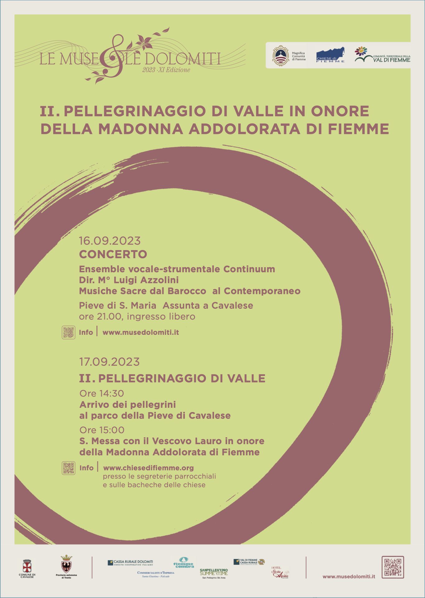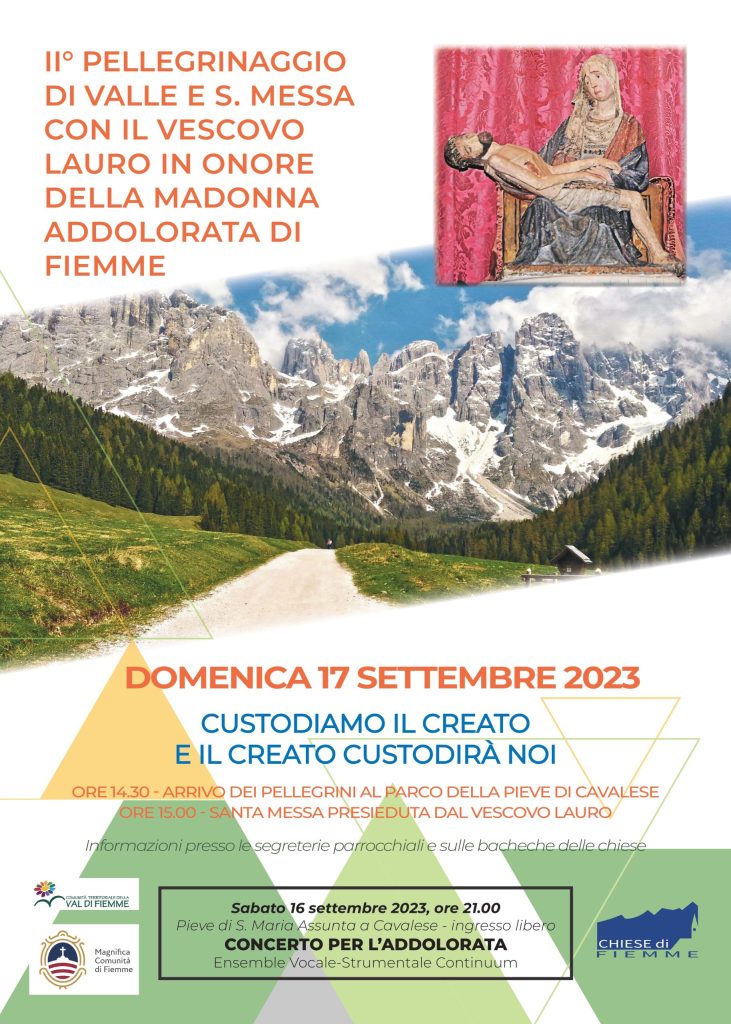 L’evento si svolgerà nel fine settimana del 16 e 17 settembre ed è proposto dalle Parrocchie, dalla Magnifica Comunità e dalle Amministrazioni comunali della Comunità Territoriale di Fiemme. Il programma comprende questo concerto sacro, a cura della nostra Associazione, la seconda edizione del Pellegrinaggio di Valle e, al culmine, la Santa Messa presso il parco della Pieve di Cavalese, presieduta dall’Arcivescovo di Trento, monsignor Lauro Tisi.